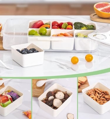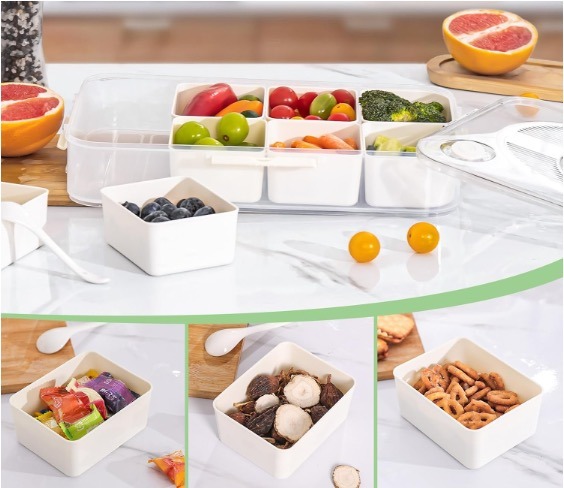 This lightweight tray features several compartments, a secure lid, and removable dip cups, making it perfect for organizing snacks, ingredients, or meal preparations for easy transport. Additionally, it is dishwasher safe!