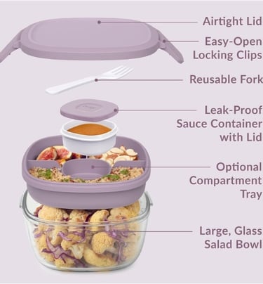 Featuring a glass salad container with three sections and a leak-proof dressing cup, this is ideal for meal prep, ensuring ingredients stay fresh while preventing mess and waste when preparing salads.