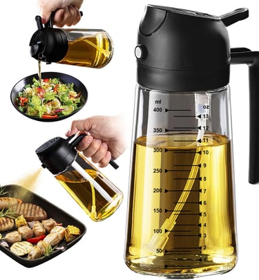 A chic reusable glass bottle equipped with a pump-spray top that allows for an even misting of oil, vinegar, or salad dressings. It includes measurement markings, a leak-proof seal, and a design that's easy to clean—perfect for healthy cooking and managing portions.